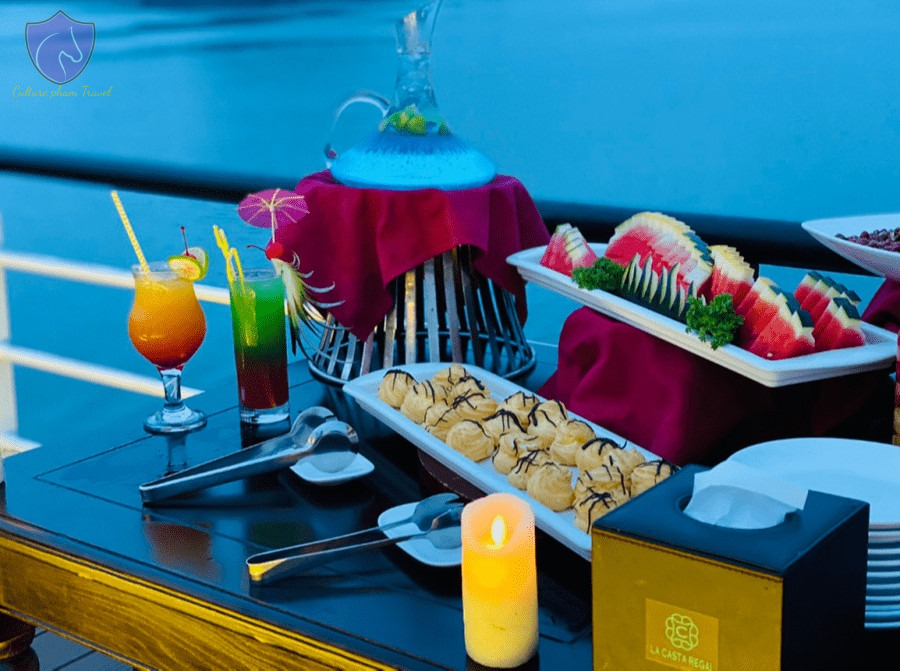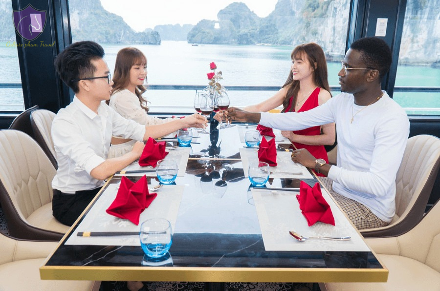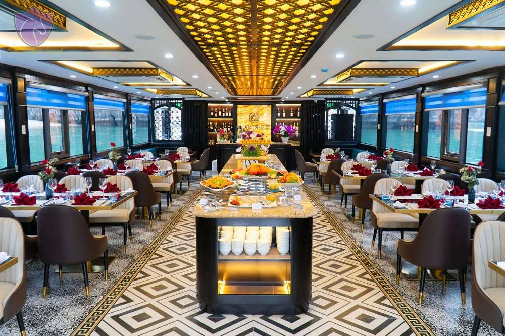 • Enjoy a high-class buffet on board to learn more about the quintessence of Vietnamese cuisine. Notably, the cruise is modern and has a spacious capacity of up to 99 guests.