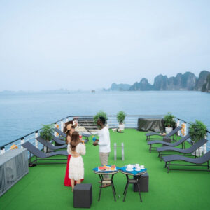 • Relax on board with an outdoor Jacuzzi with a capacity of 15 guests, a sunset party, and admire the sunset at Halong Bay.