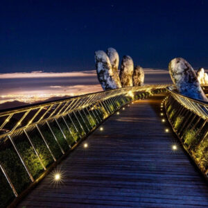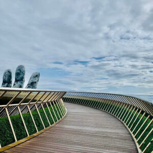 The Golden Bridge is a world-famous attraction in the Ba Na Hills complex. This fabulous bridge is 150 meters long and 5 meters wide. It span over the sky of Ba Na Hills, Da Nang, Vietnam.